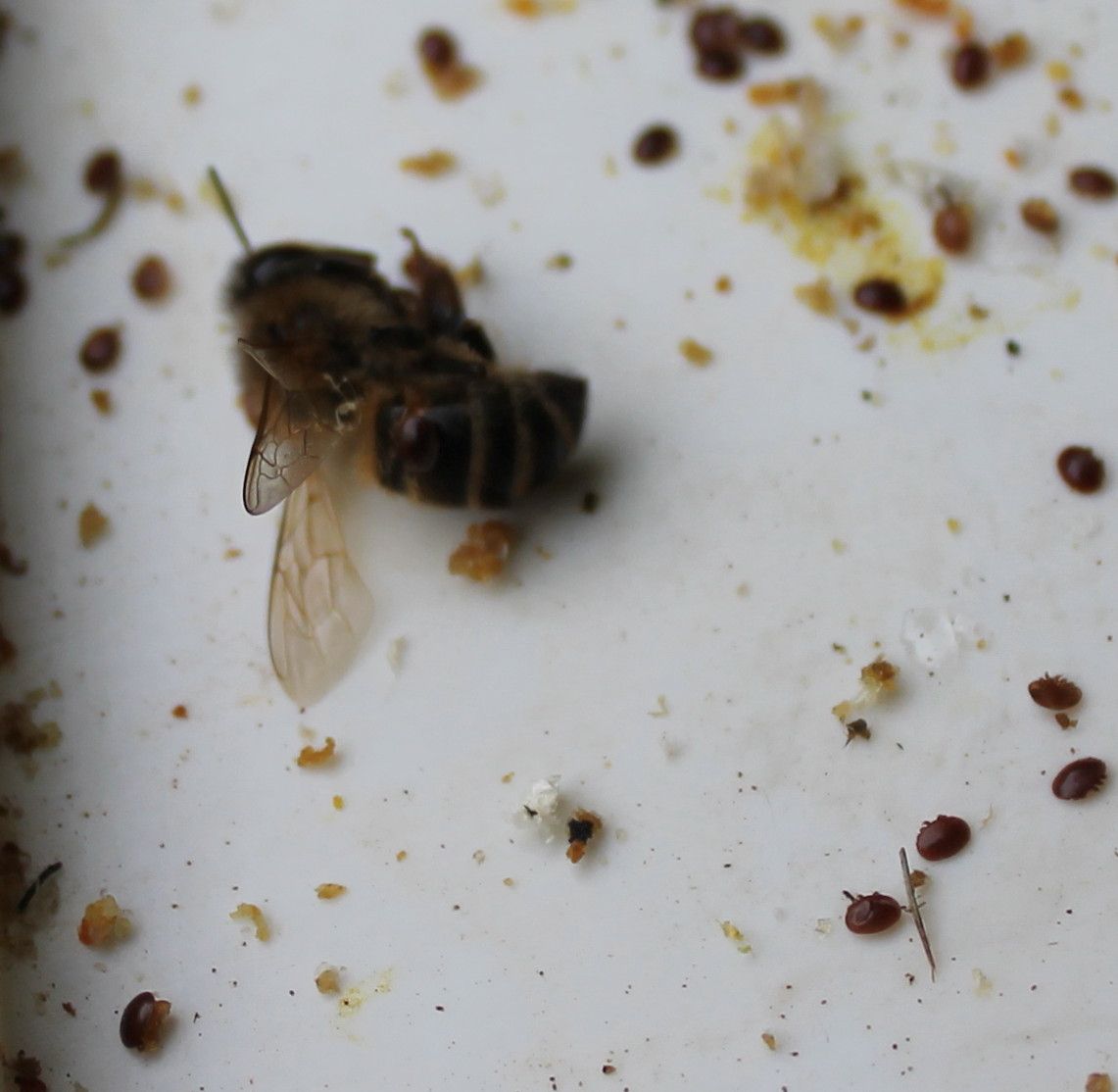 - Wash the dead bees to remove any remaining mites. Place the bees in a coarse kitchen sieve that will hold bees but let Varroa mites through. Secure a honey straining cloth or jelly bag under the sieve to retain mites. Place under a fast running tap or tap with a shower fitting to wash any remaining mites off the bees. Count the number of mites washed off.