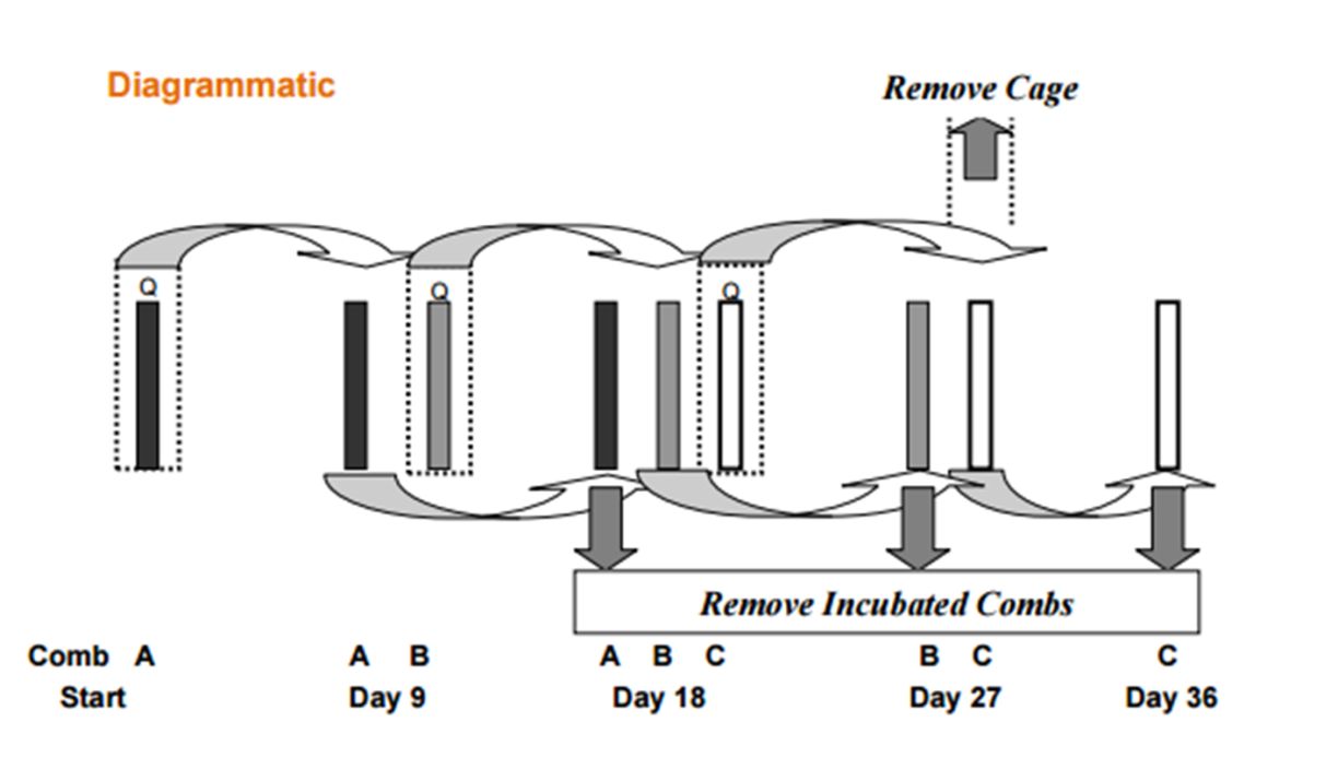 A total of three frames are used with the queen being moved from each week to a new frame