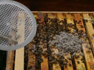 Dry the jar thoroughly. Shake bees off a brood frame, avoid taking the queen, pour the bee into the jar to the marked level. This is about 300 bees. Shake the jar gently. Then shake in about 2 tablespoons of icing sugar. Roll the jar so that the bees are coated in the icing sugar, leave for a while, and then upend the jar over a white bottomed bucket of water and shake vigorously. The icing sugar will dissolve in the water & the mites will float, the white bottom in the bucket makes it easy to count the mites. The mites will fall through the mesh, the bees will be retained and the sugar dissolves in the water, and the mites can be counted.